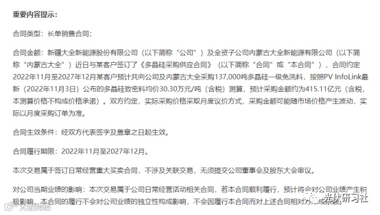 公告披露,公司及全资子公司内蒙古大全近日与某客户签订《多晶硅采购供应合同》,合同约定2022年11月至2027年12月某客户预计共向公司及内蒙古大全采购13.7万吨多晶硅一级免洗料。