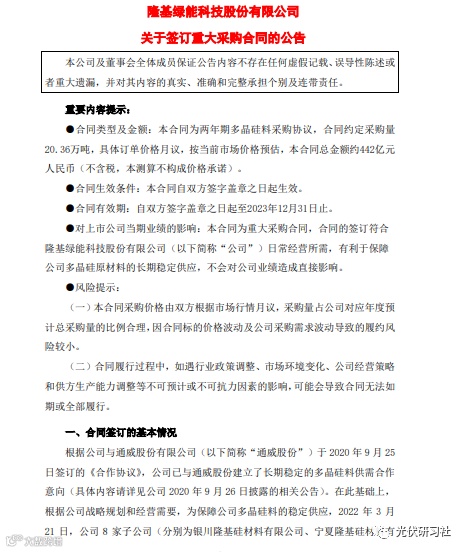 据了解,隆基股份与通威股份有限公司(以下简称“通威股份”)早在 2020 年 9 月 25 日就已经签订有相关的《合作协议》,隆基股份已与通威股份建立了长期稳定的多晶硅料供需合作意向(具体内容请详见隆基 2020 年 9 月 26 日披露的相关公告)。此次签署的多晶硅料长单采购协议,是基于上述《合作协议》签订的日常经营性长单采购合同。