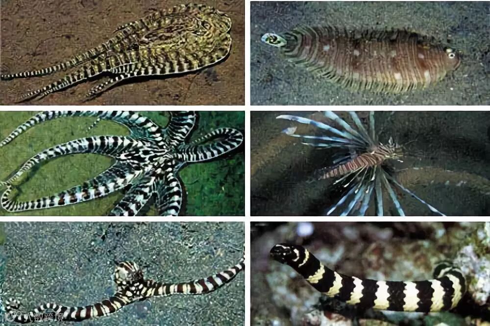 由于柔软的肢体肉质鲜美,对于很多海底食客来说都是一顿美味的大餐,所以章鱼进化出了“能够思考的皮肤”,可以在0.2秒内迅速变色融入周围环境,甚至还能通过光滑的皮肤纹理和身体与腕足的弯曲,拟态成一些稀奇古怪的的其它东西,例如海草、海蛇、狮子鱼、水母等等......