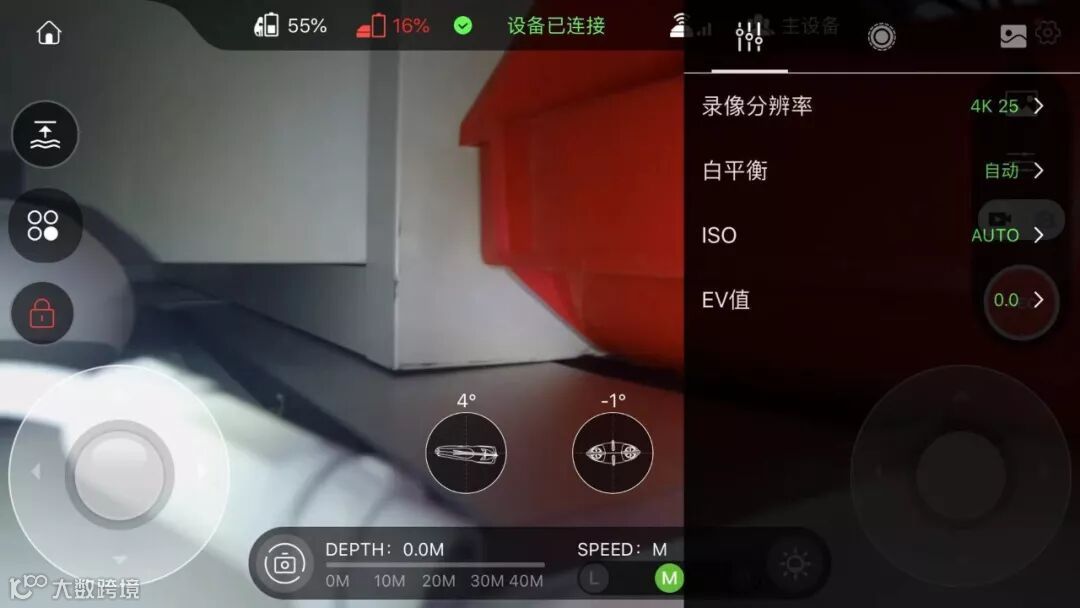 拍摄水底画面或静止物体时,切换到稳像模式。稳像模式下,船体可以通过摇杆调整船体相机的俯仰角度,在不操控俯仰控制摇杆的时候,船体可以自行锁定俯仰角度。最大俯视角度为-30°,最大仰视角度10°。可在APP内实时查看船体姿态。但是此模式下无法锁定船体深度。当船体为俯视状态时,船体会缓慢状下潜。当船体为仰视状态时,船体会缓慢上升。