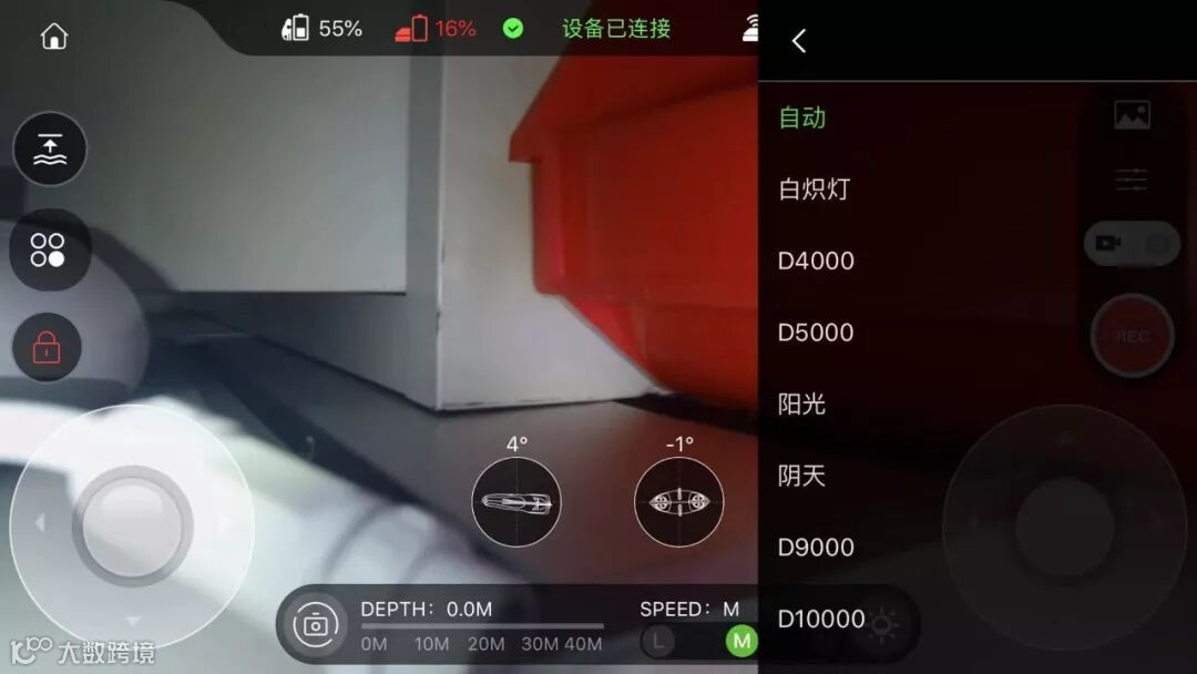 拍摄水中物体或运动物体时,切换到定深模式,此模式下,船体可以通过浮潜杆操作实现船体深度的控制,在不操作浮潜杆的情况下,船体可自行锁定船体当前深度。相比稳像模式,运动控制操控较为灵活,使船体快速移动、上浮、下潜。可以尝试使用此模式追逐水中“猎物”。