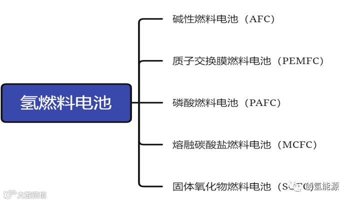 燃料电池类似于锂离子电池,分为三元锂、磷酸铁锂、锰酸锂电池等多种类产品,氢燃料电池也并非只有一种技术路线。按照电解质的差异,氢燃料电池类型分为碱性燃料电池(Alkaline fuel cell,缩写AFC)、质子交换膜燃料电池(Proton exchange membrane fuel cell,缩写PEMFC)、磷酸燃料电池(Phosphoric acid fuel cell,缩写PAFC)、熔融碳酸盐燃料电池(Molten carbonate fuel cell,缩写MCFC)、固体氧化物燃料电池(Solid oxide fuel cell,缩写SOFC)。