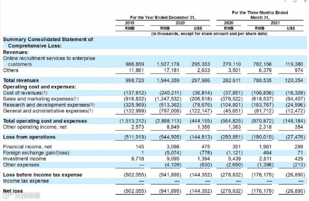 不过,近两年来,或许是因为情色招聘、广告欺诈、大幅提价等事件,BOSS直聘的风评不断受到影响。再加上其对企业客户依赖度较高,广告营销费用成本高企,2019年至2021年第一季度,BOSS直聘累计亏损金额已经达到8.81亿元。