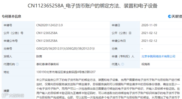 1月19日,北京字跳网络技术有限公司公开“数字货币钱包的生成方法、数字货币支付方法、装置和电子设备”专利。2月12日,北京字跳网络技术有限公司又公开了 “电子货币账户的绑定方法、装置和电子设备” 专利,公开号为CN112365258A。