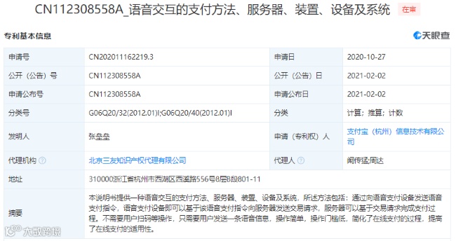 2月2日,支付宝也公开了一项与语音交互相关的支付专利,名为“语音交互的支付方法、服务器、装置、设备及系统”,该专利申请于2020年10月。
