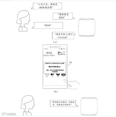 比如用户要充话费,可以向音箱发出语音指令:“小艺小艺,帮我充100块钱话费”。音箱收到语音指令后,向用户回复:“请跟我念0324”。用户随即跟读:“0324”,音响便可以对用户的声纹进行验证,验证通过后提示用户在手机上进行二次认证。同时,手机在收到音箱的指示后,自动弹出提醒框,显示“给尾号为****的手机充值100元话费,请进行指纹验证”,指纹验证通过后,充值成功。