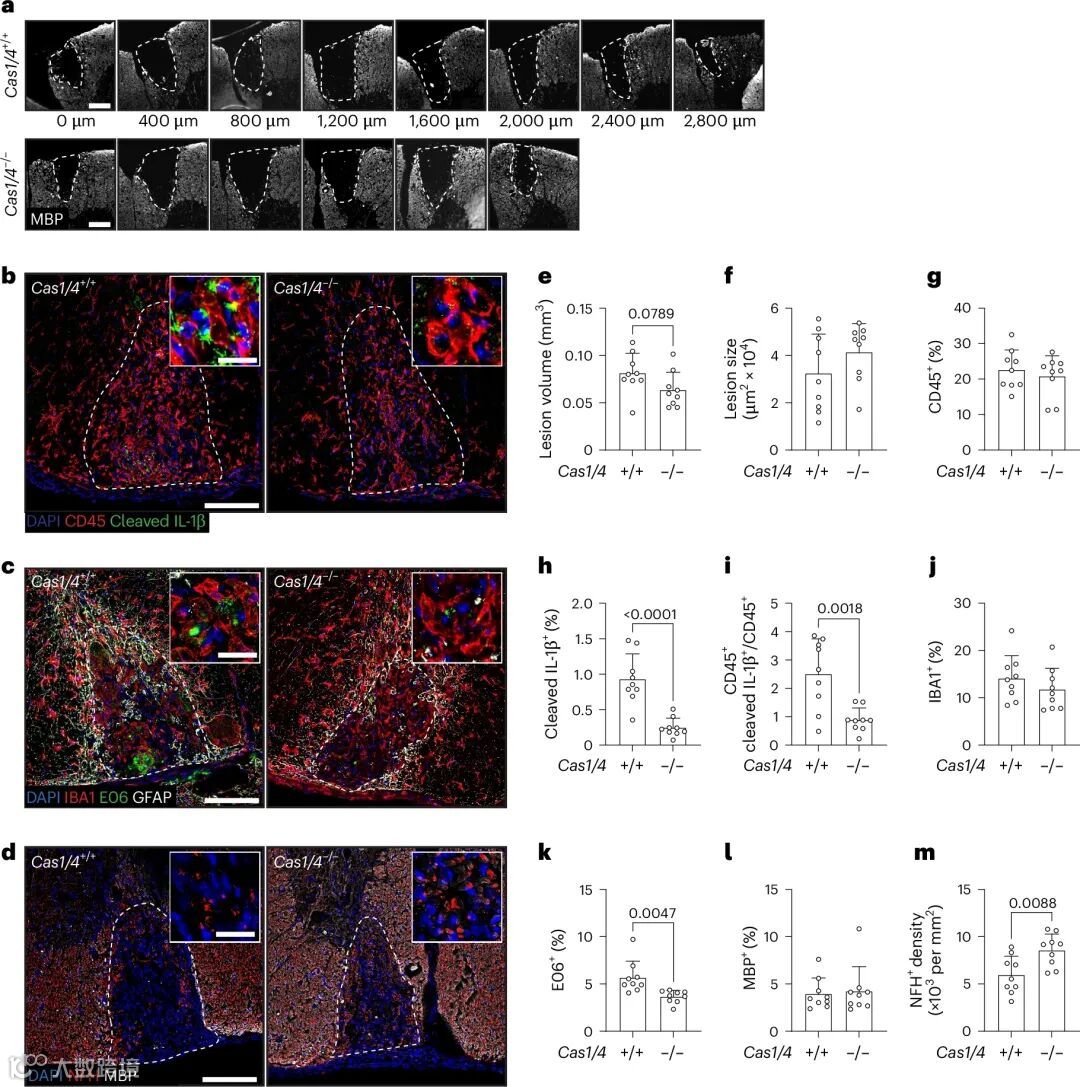 研究进一步揭示了OxPC与IL-1β之间存在着正反馈循环:OxPC能促进IL-1β分泌,而IL-1β又能诱导更多OxPC生成。在缺失Casp1/4(IL-1β成熟所需蛋白酶)的小鼠中,慢性OxPC病变明显减轻。而使用IL-1受体拮抗剂anakinra治疗,能显著减少OxPC积累并保护轴突。
