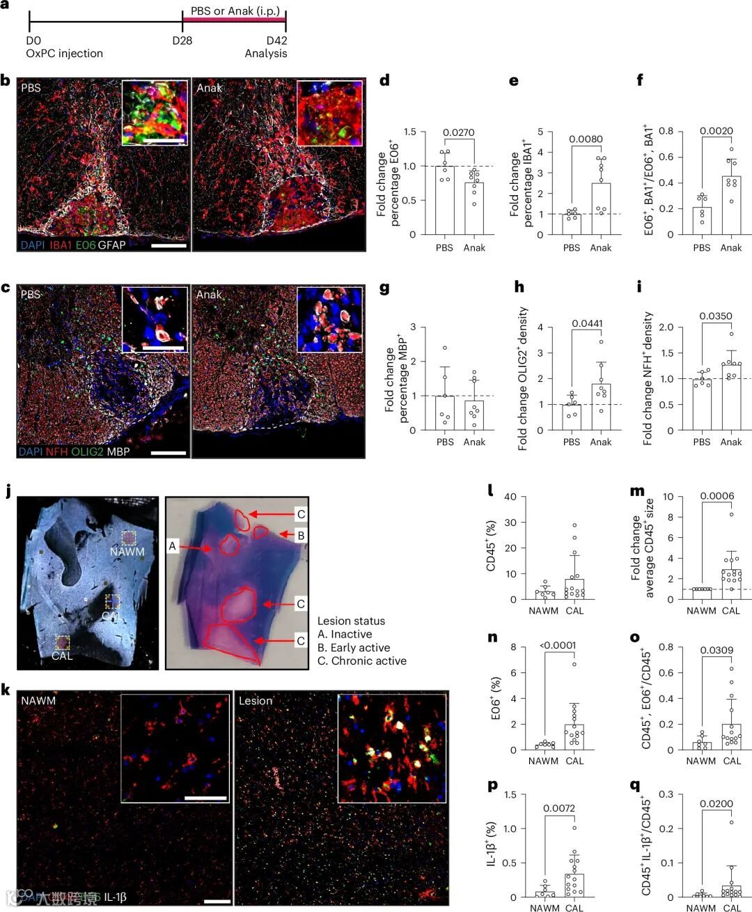 使用IL-1受体拮抗剂anakinra治疗,能显著减少OxPC积累并保护轴突。在P-MS患者的脑组织样本中,研究团队验证了上述发现:慢性活动性病变的边缘区域,OxPC和IL-1β水平显著高于正常白质区,且与活化的免疫细胞共定位。这进一步支持了OxPC/IL-1β轴在人类P-MS中的病理意义。