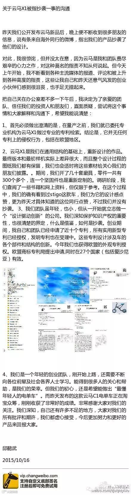 4、云造在2014年11月4日给那个“样机”申请了专利,然后2014年12月3日就给最终版的产品X1申请了专利。原创设计师花了 7 年研发出Stigo,云造科技从样机到成品就花了 1 个月。