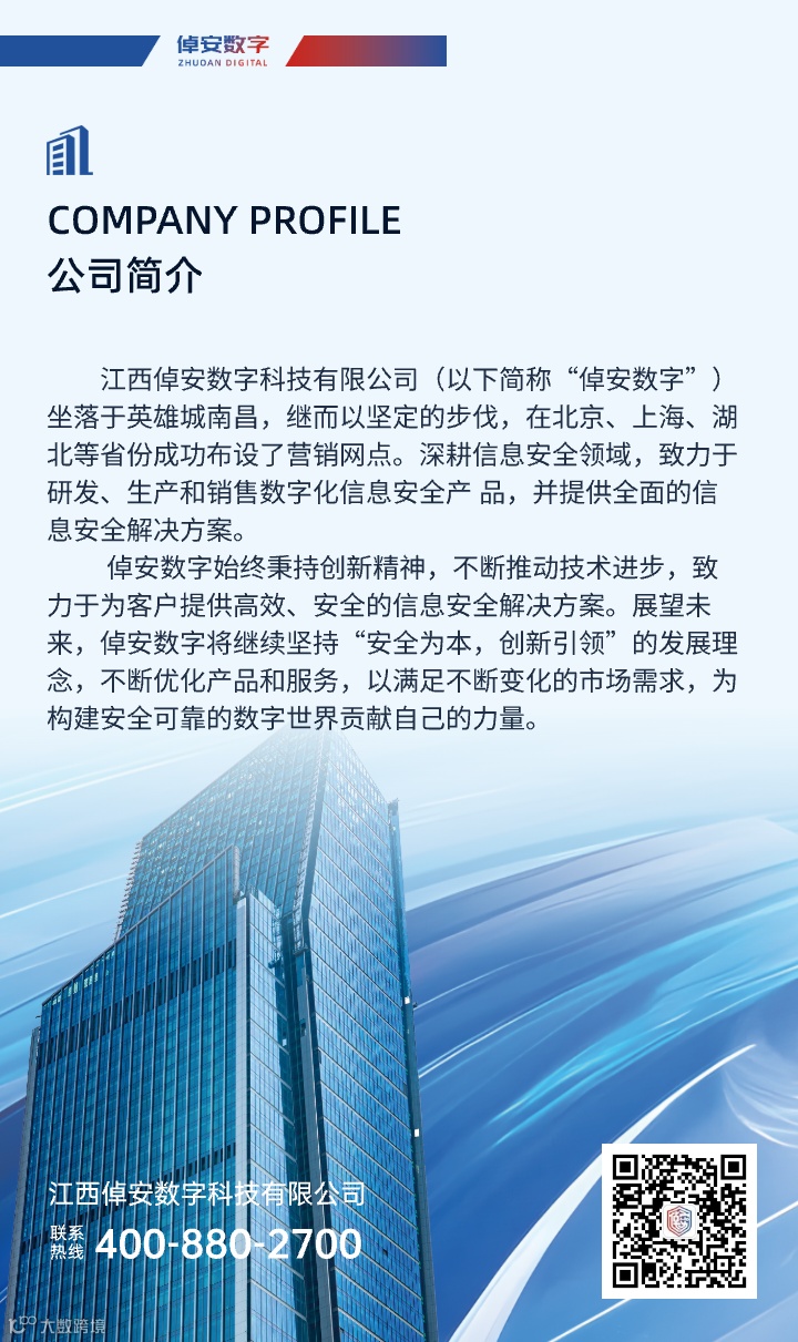 江西倬安数字科技有限公司成立于2018年,立足于信息安全领域,致力于数字化信息安全产品的研发、销售并提供整体解决方案。