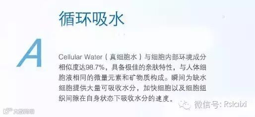 完整的保湿必须包含三个步骤:“吸水、活水、锁水”,帮助肌肤达成一个畅通的循环保湿系统,解决多层次失水引起的肌肤问题,活化面部肌肤水分源泉,使每一寸肌肤都细嫩、通透,细胞恒润健康。