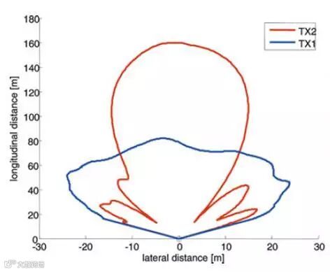 天线阵列,从上至下分别是10条发射天线TX1,然后是2条发射天线TX2,最后是4条接收天线RX1至RX4。两组发射天线分别负责探测近处和远处的目标。天线阵列和覆盖范围如下图所示: