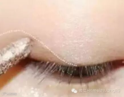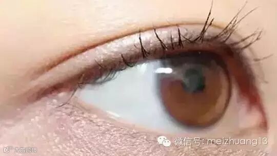 第三步:选择浅咖色或者浅米色眼影膏,用眼影刷轻轻着色在上眼皮后半部分(如图所示),然后紧挨睫毛根部细致地画一条咖色眼线,眼尾处无需拉长。
