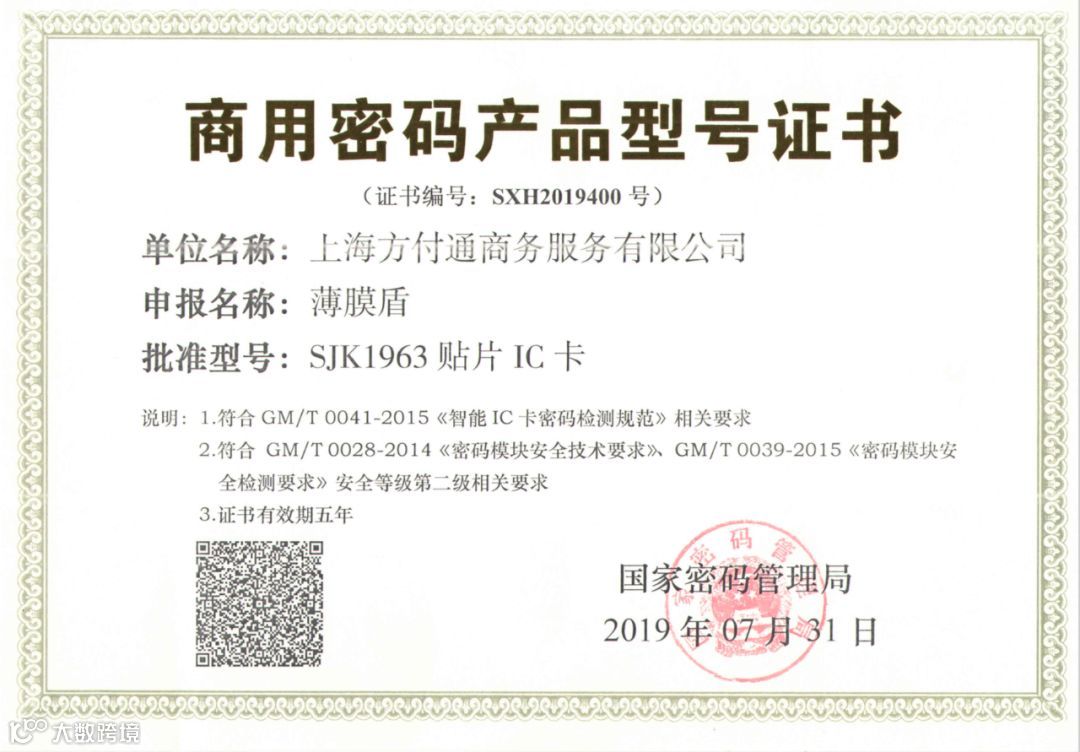 国密芯片自主研发 方付通薄膜盾获得国家密码管理局颁发的《商用密码产品型号证书》