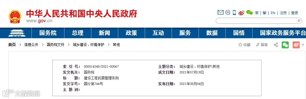 《建设工程抗震管理条例》已经2021年5月12日国务院第135次常务会议通过,现予公布,自2021年9月1日起施行。
