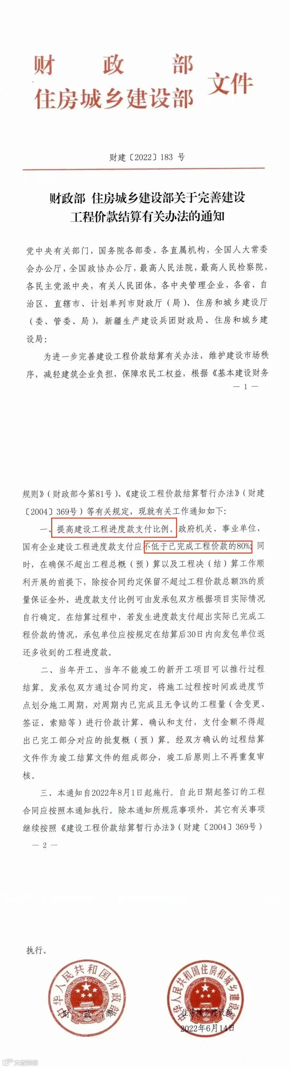 近日,财政部、住建部发布关于完善建设工程价款结算有关办法的通知,自2022年8月1日起施行。