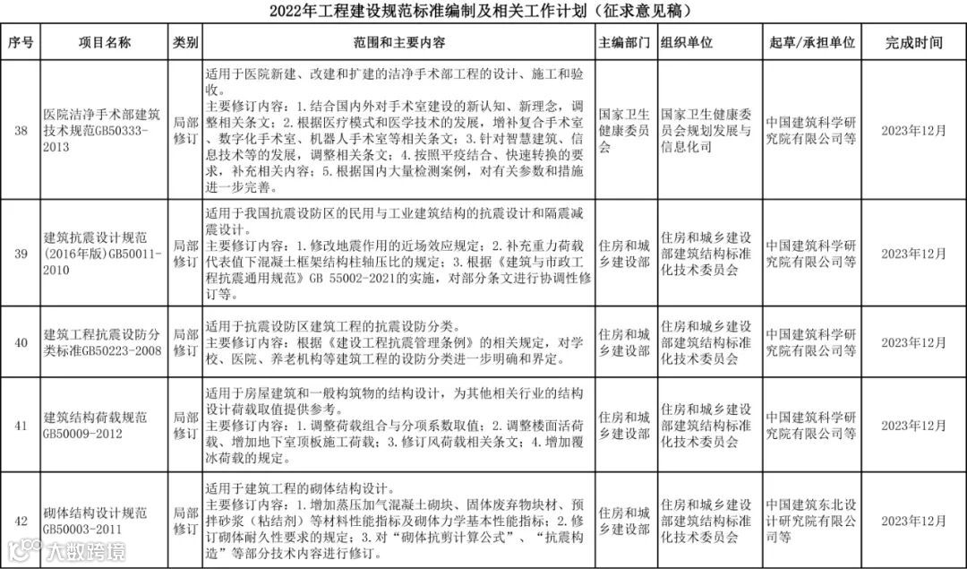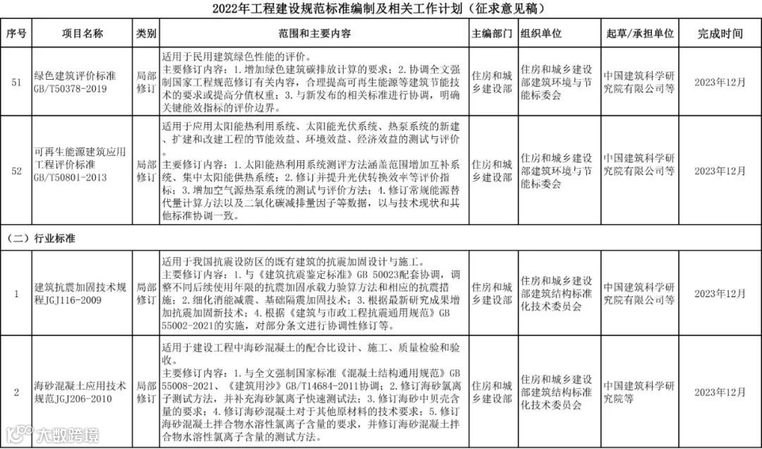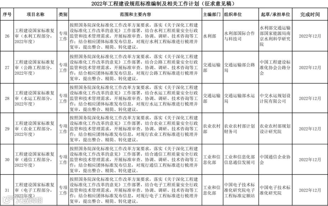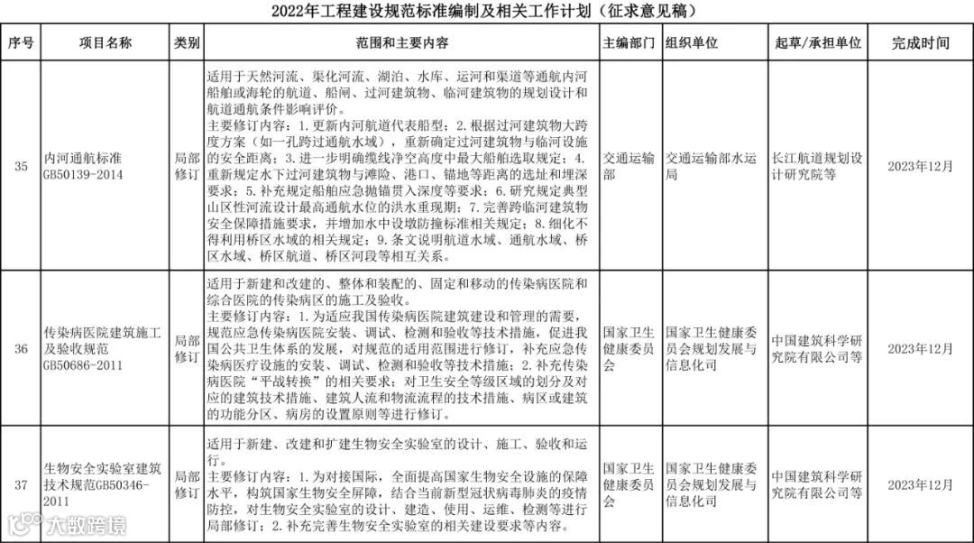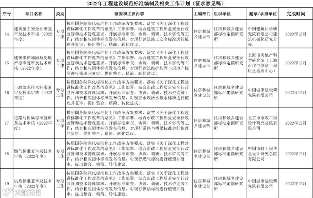 为满足工程建设需要,落实工程建设标准体制改革要求,完善工程建设规范体系,住房和城乡建设部研究提出了《2022年工程建设规范标准编制及相关工作计划(征求意见稿)》,并于近日向社会公开征求意见。意见反馈截止时间为2021年12月27日。