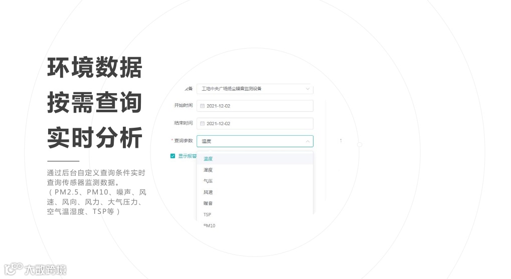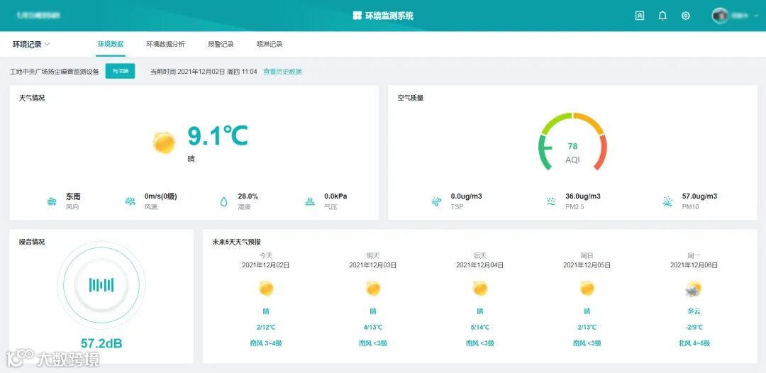 2、构建可视化数据大屏,通过管理平台将户外传感器监测数据进行集中展示、分析比较,通过更直观的图表样式进行展现,便于查询、管理所有在建工地实时动态,打破信息孤岛。