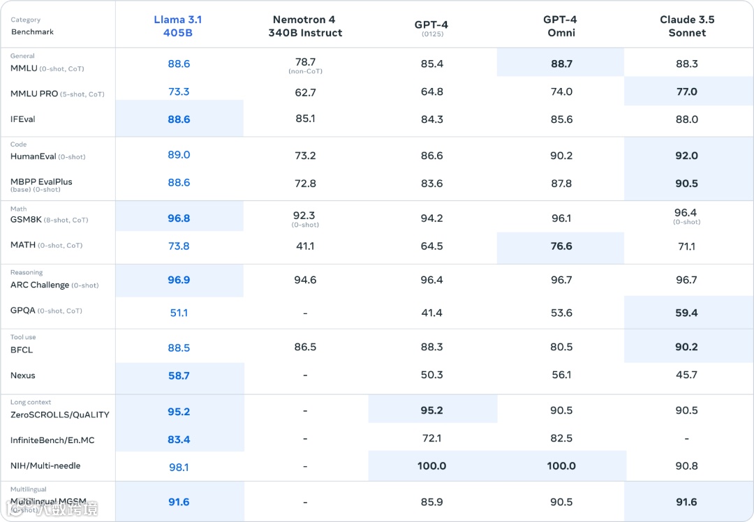Llama 3.1 405B 是首个在常识、可操纵能力、数学、工具使用和多语种翻译等方面媲美顶级闭源人工智能模型的公开发布的模型。
