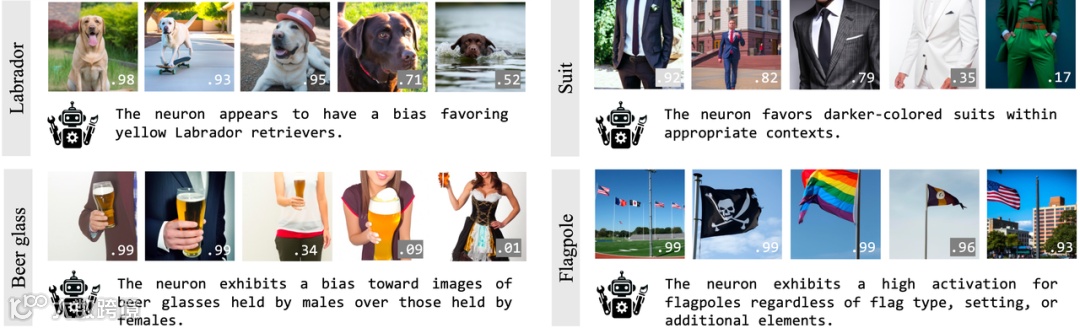 在数据集中,每个狗品种与特定背景(例如雪,丛林,沙漠,海滩)虚假相关,而在测试集中,品种-背景配对是混乱的。研究团队使用 MAIA 来找到一个最终层神经元的子集,该神经元可以独立于虚假特征鲁棒地预测单个狗的品种,只需改变用户提示中的查询。