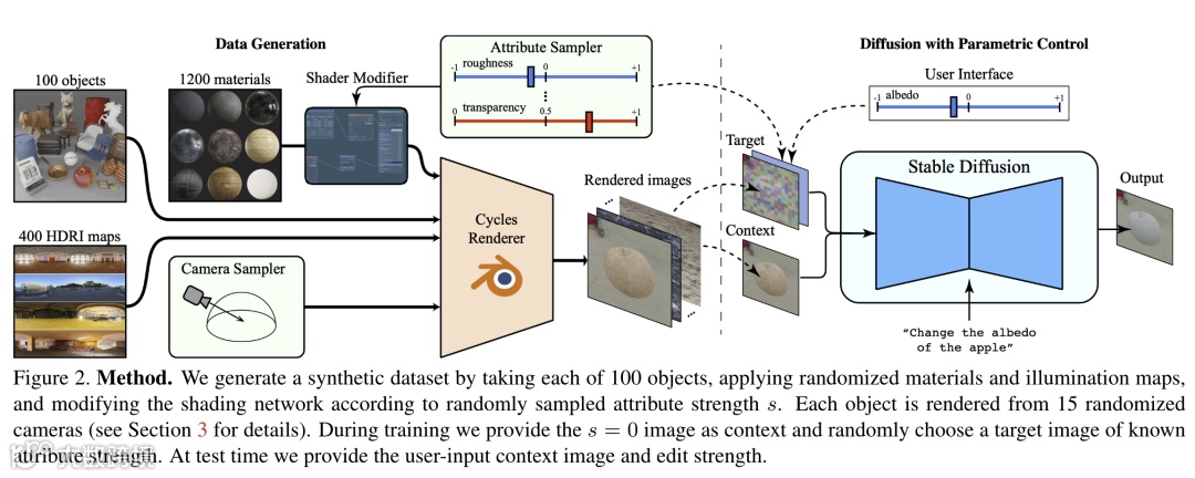 为了克服第一个挑战,研究团队渲染了一个具有基于物理的材料和环境地图的合成数据集,随机编辑了 1200 种材料的材料属性,从而解决了对材料属性进行细粒度标注的需求。