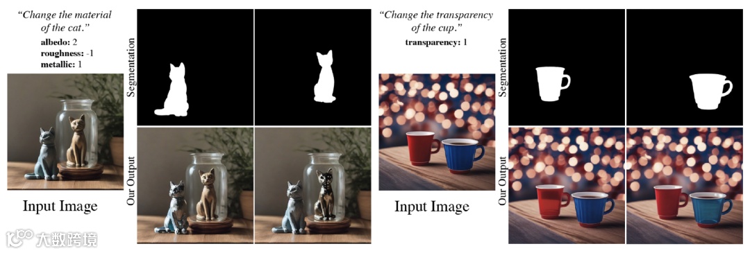 如下图所示,如果是两只猫或两个杯子,可以使用特定实例的分割图来掩盖相对的材质变化。