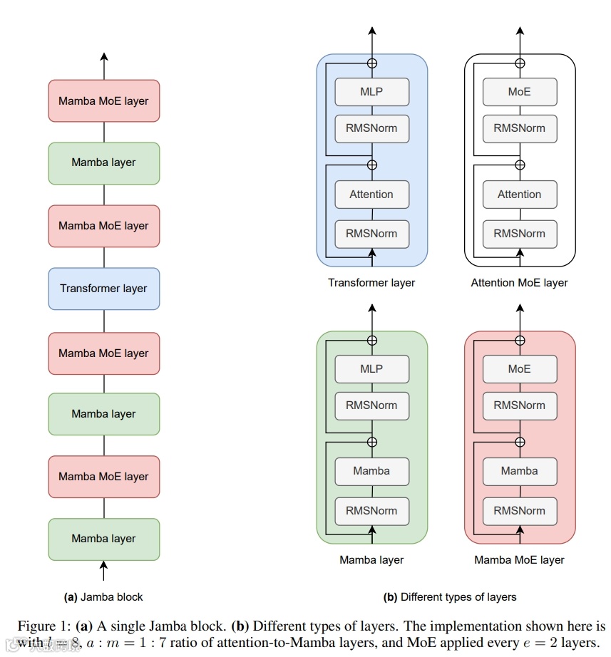 具体来说,Jamba 将 transformer 层和 Mamba 层的区块交错在一起,同时享受两个模型系列的优势。在其中一些层中添加了 MoE,以增加模型容量,同时保持活动参数使用的可管理性,这种灵活的架构允许针对特定资源和目标进行配置。