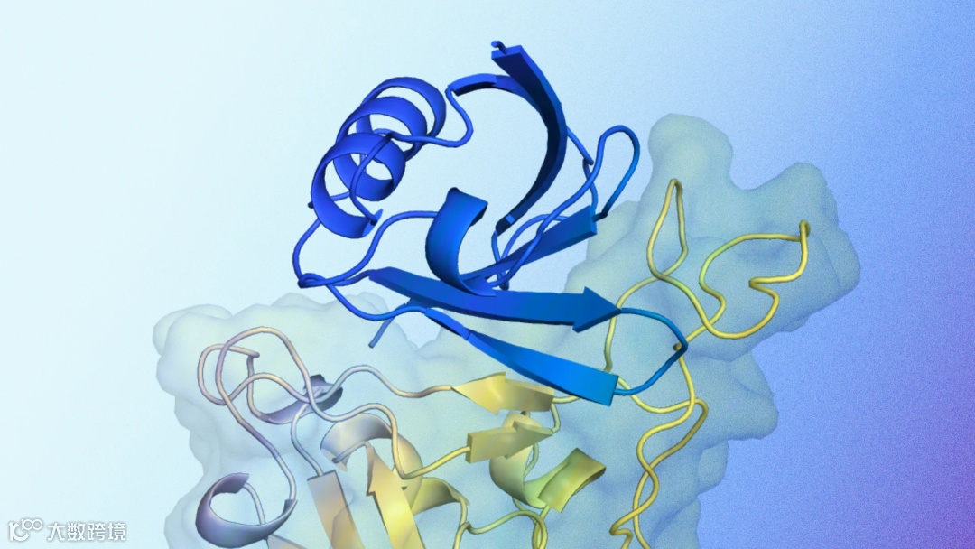 视频|预测的蛋白质结合体结构与目标蛋白质相互作用的示意图。蓝色显示的是 AlphaProteo 生成的预测蛋白质结合结构,黄色显示的是目标蛋白质。