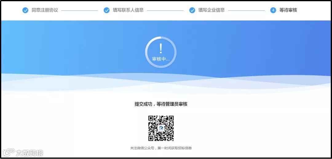 提交信息成功后,平台运营方会对您的信息进行审核,您可扫码关注微信公众号,第一时间获取招标信息。