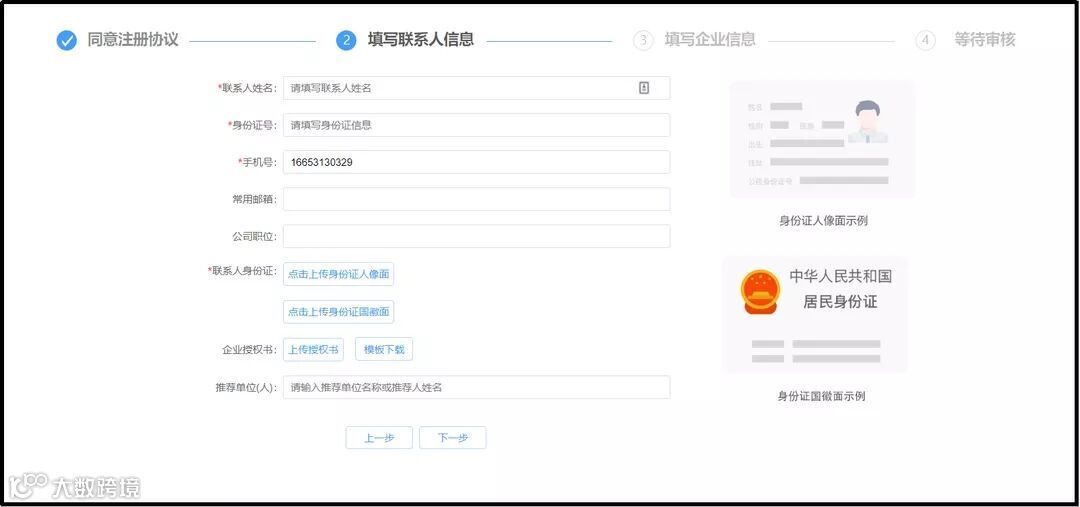 如实填写企业联系人信息,并上传联系人身份证附件(红色*号为必填项)选择性上传企业授权书,若您是被推荐注册,请填写推荐单位或推荐人的名称。
