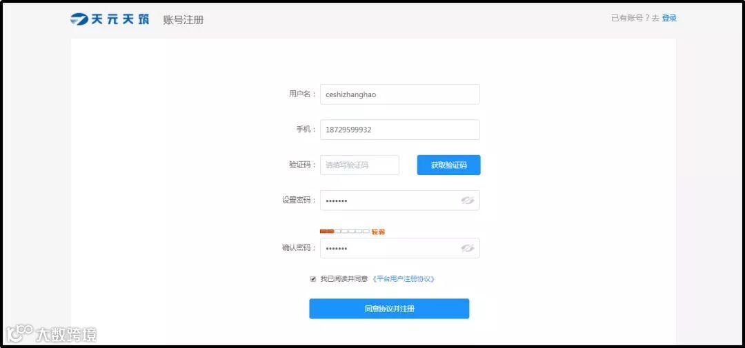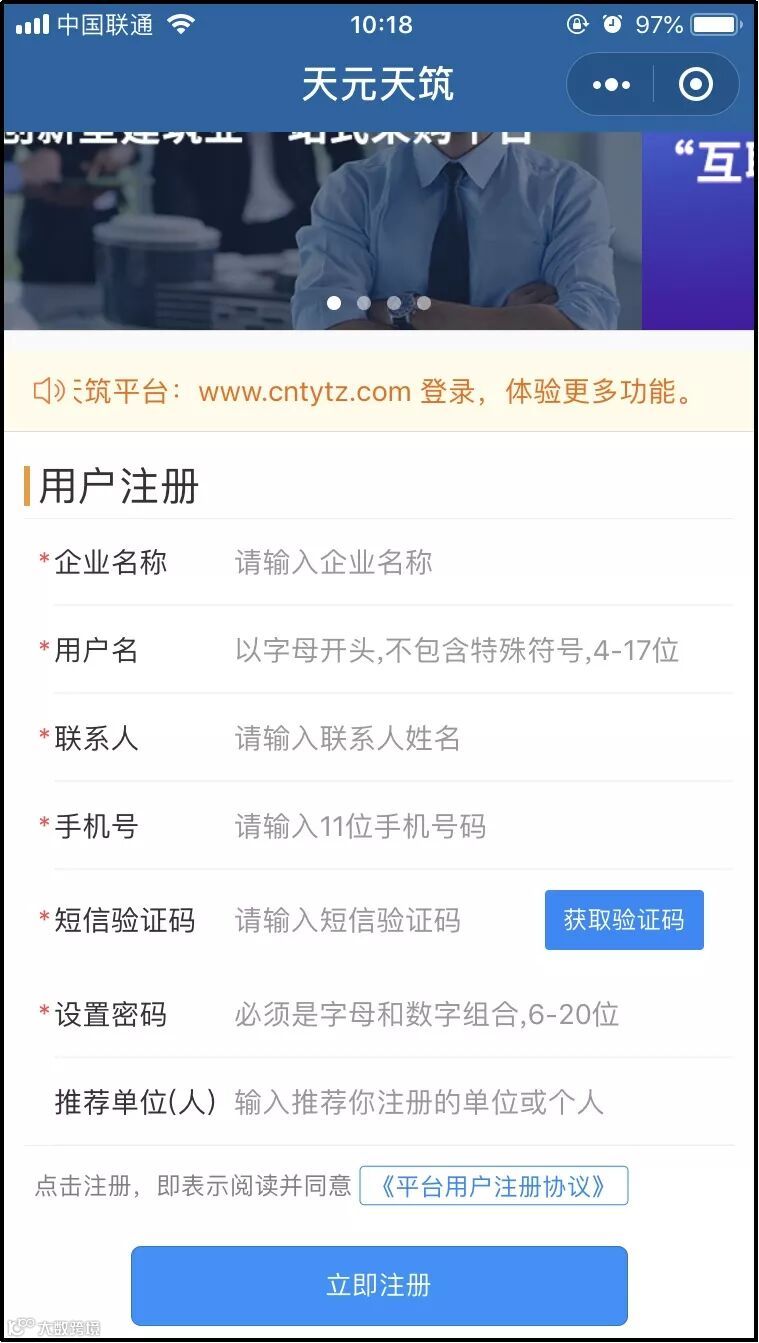 1、天元天筑平台目前提供了电脑端注册和微信注册两种方式;