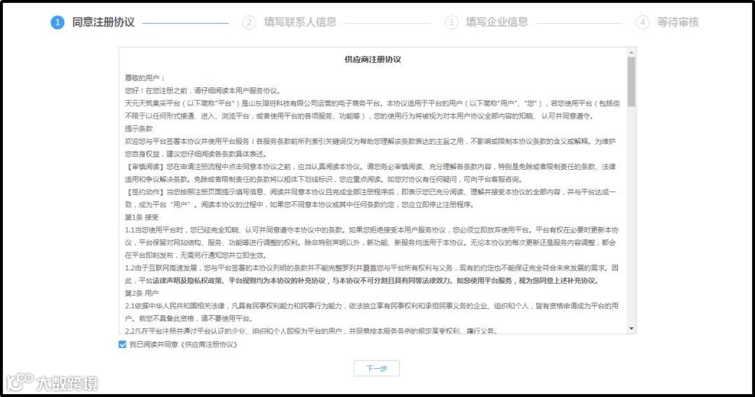 第四步:同意并勾选《供应商注册协议》, 并点击【下一步】