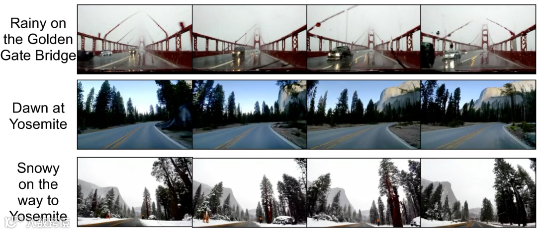 图|自动驾驶的生成模拟。借助互联网知识,可以模拟特定地点的不同驾驶条件,如“金门大桥上的雨”(上)、“优胜美地的黎明”(中)和“前往优胜美地的路上下雪”(下)。