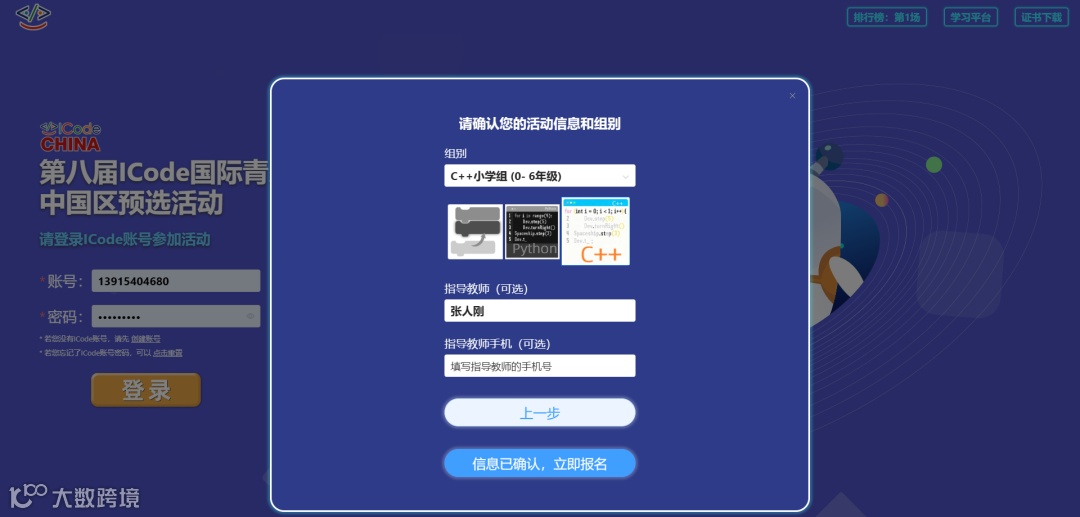 (6)个人信息确认无误后,点击下一步,选择报名组别、指导教师和指导教师手机号(指导老师信息将作为评比优秀指导老师的依据,请准确填写),填写完成后,点击信息已确认,立即报名。