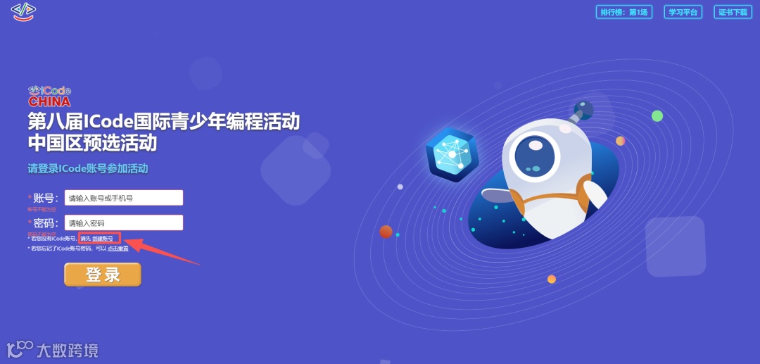 (2)已有ICode平台账号的选手,直接填写账号、密码,点击登录。