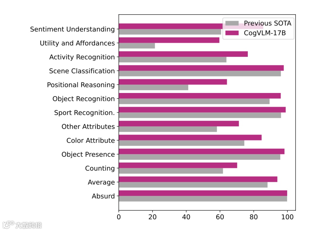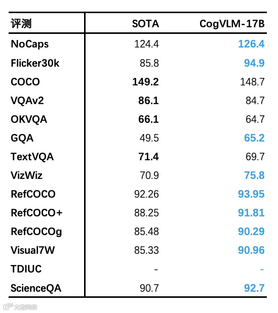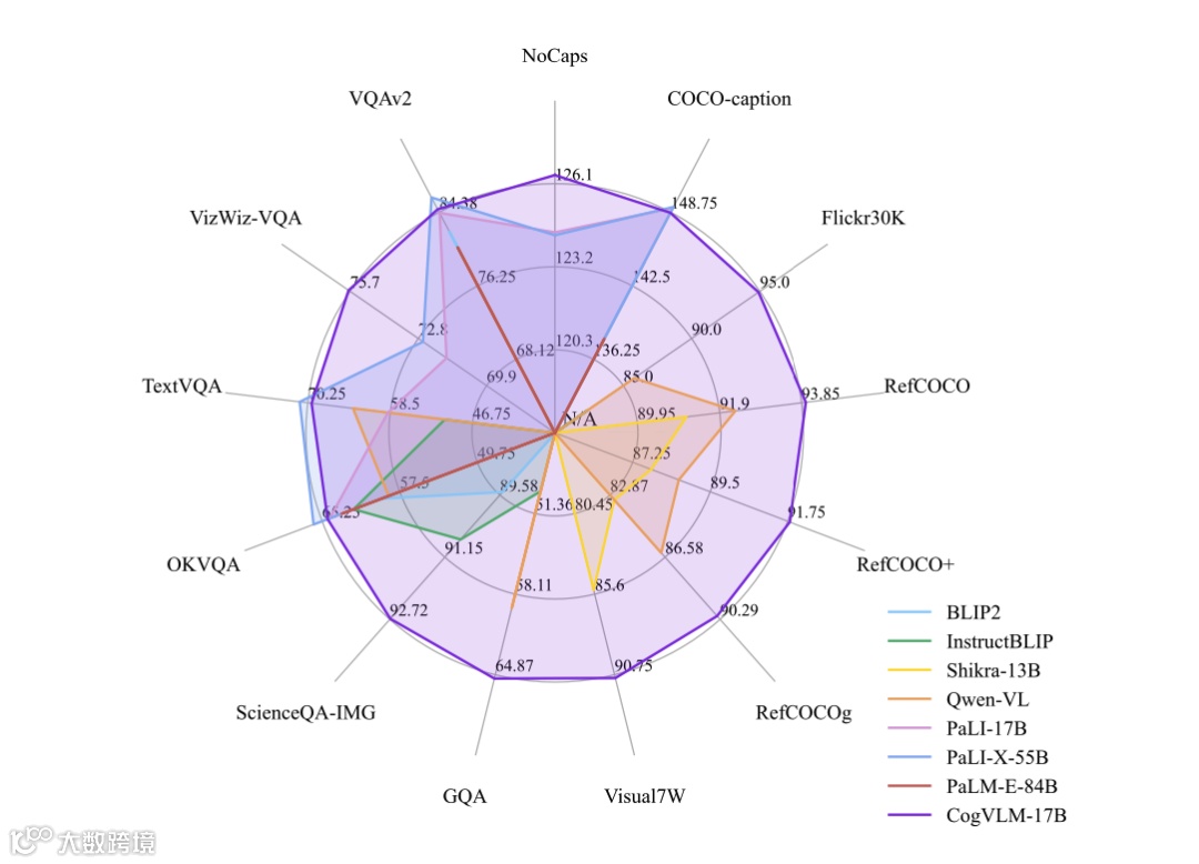 也是基于此,虽然 CogVLM在性能上已经超过一众大公司的闭源模型(例如PaLI、PaLM-E、BEiT-3、GIT2等),但我们依然选择像 VisualGLM一样,把它开源出来。我们希望能通过开源来进一步地促进多模态模型在研究和工业应用方面的发展。