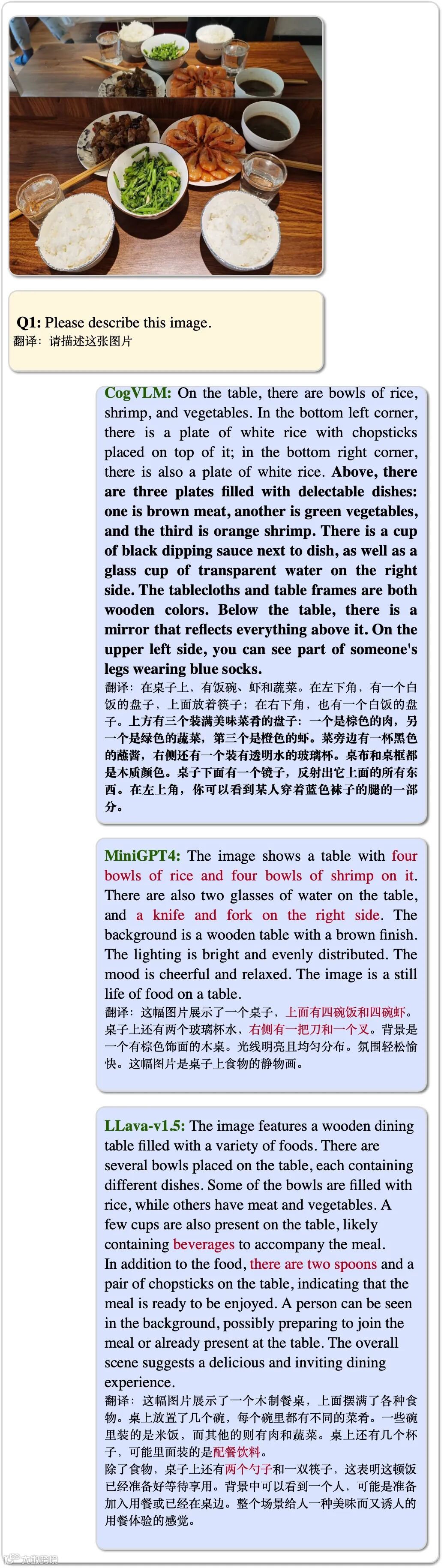 这张图片内容较为复杂,是日常生活的场景。CogVLM精准地说出来所有的菜肴和餐具的种类,并且判断出了镜子(“许多动物甚至不能理解镜子”)是反射而并非真实,且注意到了角落的人的腿。整个复杂的描述中未出现错误与幻觉。相对地,MiniGPT-4和LLaVA-1.5都出现了幻觉现象且不够全面。