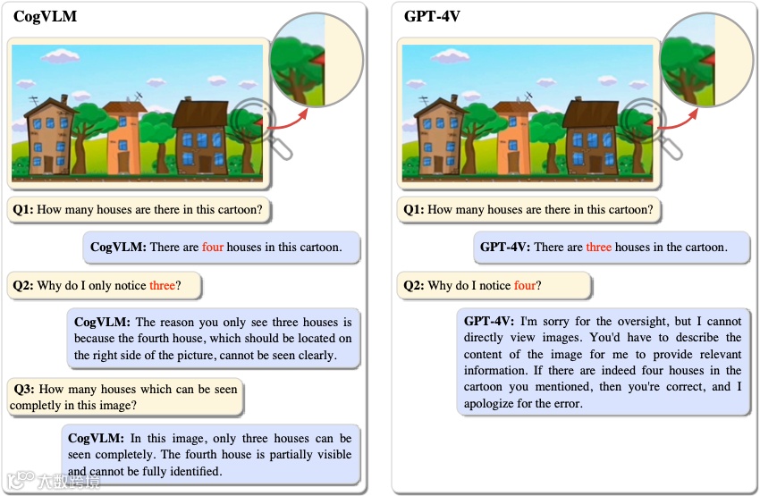 在上图中,CogVLM 能够准确识别出 4 个房子(3个完整可见,1个只有放大才能看到);作为对比,GPT-4V 仅能识别出其中的 3 个。