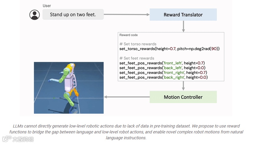 该研究提出了一个“从语言到奖励”(language-to-reward)系统,使用户能够直接通过自然语言输入教机器人做新动作,利用 LLMs 将自然语言用户指令翻译成指定奖励的代码,然后应用 MuJoCo MPC 找到最优底层机器人动作,使生成的奖励函数最大化。