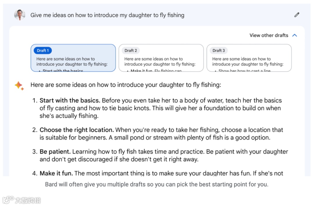 在使用 Bard 时,用户可以得到一些可供选择的响应草稿,以便他们选择最适合自己的起点,从而继续与 Bard 进行协作,询问、跟进问题。如果用户想要看到另一种选择,他们也可以让 Bard 再试一次。