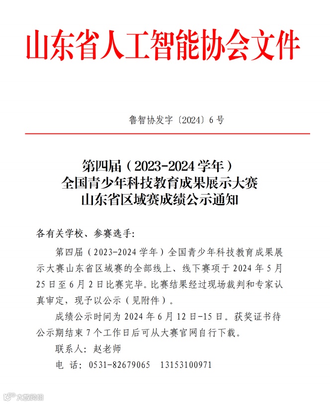 第四届(2023-2024学年)全国青少年科技教育成果展示大赛山东省区域赛的全部线上、线下赛项于2024年5月25日至6月2日比赛完毕。比赛结果经过现场裁判和专家认真审定,现予以公示(见附件)。