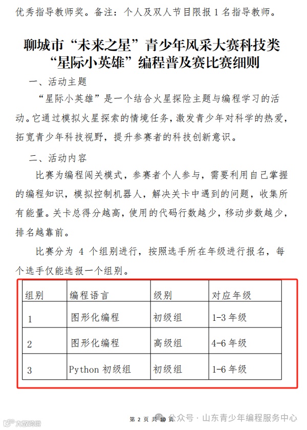 下面是聊城市“未来之星”青少年风采大赛—“星际小英雄”编程普及赛的详细文件: