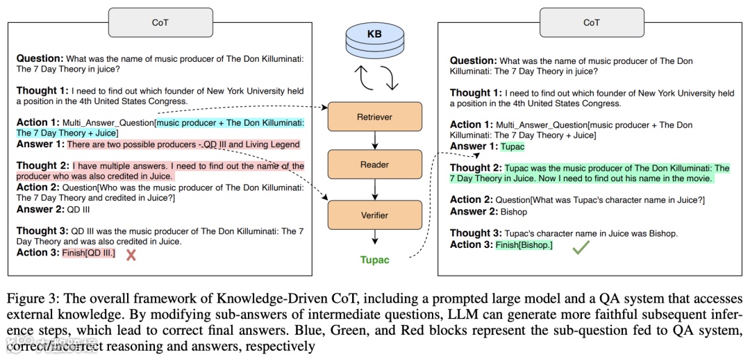 大语言模型(LLMs)配备了思维链(CoT),在各种下游任务中表现出令人印象深刻的推理能力。即便如此,由于存在幻觉和无法访问外部知识的问题,尤其是在回答知识密集型任务(如 KBQA)时,LLMs 经常会出现不正确或不真实的中间推理步骤。为了缓解这一问题,研究人员提出了一个名为知识驱动的思维链(KD-CoT)的框架,通过与外部知识的交互来验证和修改 CoT 中的推理踪迹,从而克服幻觉和错误传播。经过大量在 WebQSP 和 ComplexWebQuestion 数据集上的实验证明,所提出的KD-CoT在解决推理生成任务中表现出显著效果,其绝对成功率分别为 8.0% 和 5.1%,优于普通 CoT ICL。此外,所提出的反馈增强型检索器在检索知识方面优于最先进的基线,显著提高了 Hit 性能。