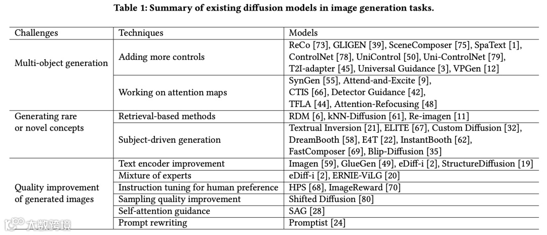 一项研究对现有的图像生成扩散模型进行了整理。扩散模型是一类生成模型,它采用一种独特的方法来生成图像,逐步向图像中添加噪声,直到图像完全退化。去除噪声的反向过程与图像生成的概念一致。一种主要方法是与检索系统相结合。该方法建议从检索系统中获取罕见或未见过的对象信息,从而引入新的概念。检索系统中获取罕见或未见过的对象信息,从而将新概念引入模型。给定主体驱动生成是一项根据给定图像生成图像的任务。目前有多种技术,包括微调和利用图像编码器来提高模型生成高质量图像的能力。