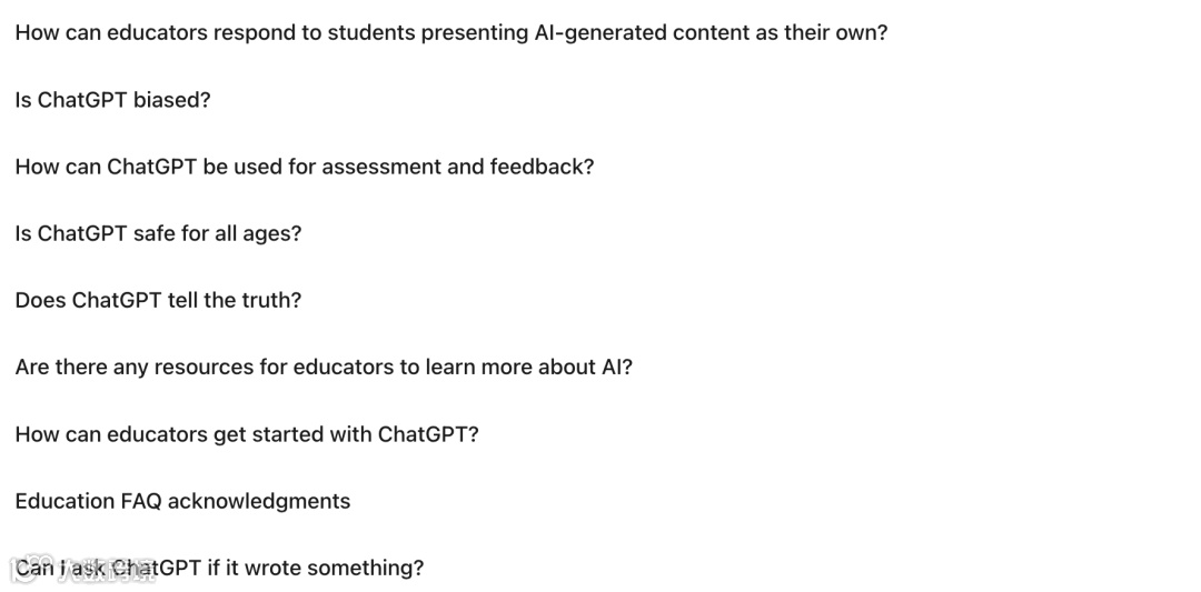 为此,OpenAI 还提供了一些资源,其中包括来自领先教育组织的简介材料链接,介绍如何运用 AI 进行教学的方法,以及针对教育工作者关于如何有效利用 ChatGPT 进行教育的常见问题的详细解答。