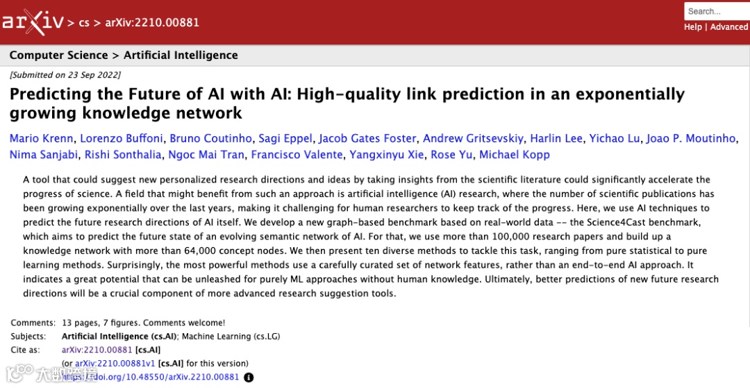 为此,由马克斯·普朗克光科学研究所(MPL)人工智能科学家 Mario Krenn 领导的国际团队发布了一项关于“指数级增长知识网络中的高质量链接预测”的研究。相关研究论文以“Predicting the Future of AI with AI: High-Quality link prediction in an exponentially growing knowledge network”为题,发表在预印本网站 arXiv 上。
