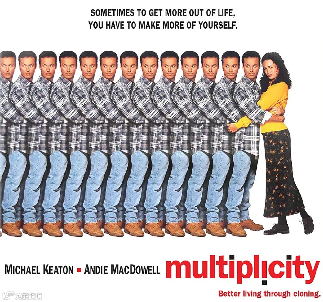 1966年,在由Michael Keaton主演的科幻喜剧电影《丈夫一箩筐》(Multiplicity)中,剧中主角 Doug Kinney 在 Leeds 博士的帮助下成功克隆了自己,随后又制作了“克隆人的克隆人”,其结果是,后代克隆人的智力水平均呈现出了指数级下降,愚蠢程度不断增加。