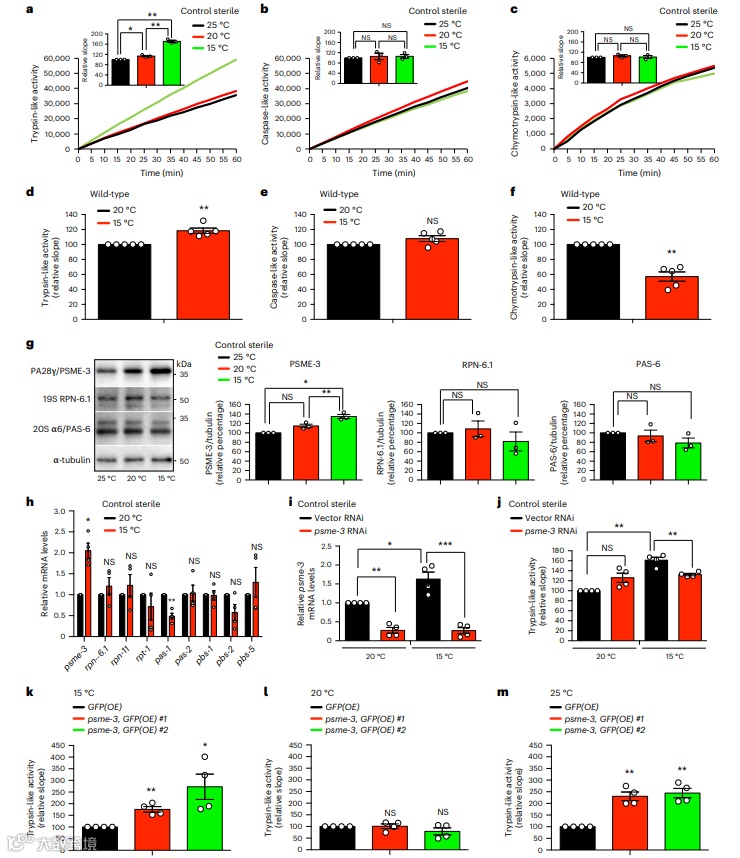 在 PA28 亚基中,线虫表达与人类 PA28γ/PSME3 同源的 PSME3。值得注意的是,定量蛋白质组学显示在低温下 PSME-3 水平增加,PSME-3 蛋白水平的增加与低温下 mRNA 数量的上调相关。