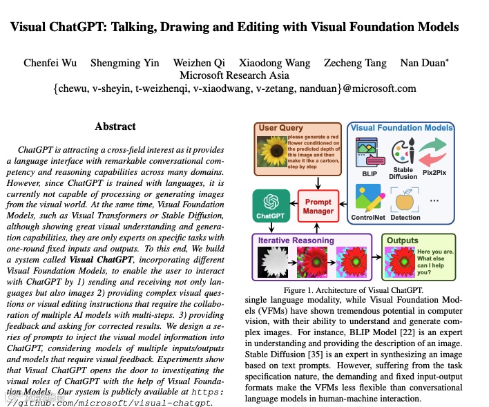 微软研究人员在发表于预印本网站 arXiv 上的论文中写道,“ChatGPT 正在吸引跨领域的兴趣,因为它提供的语言界面具有强大的对话能力和在许多领域的推理能力。然而,由于 ChatGPT 是用语言数据来训练的,它目前还不能处理或生成图像。同时,视觉基础模型,如 Visual Transformers 或 Stable Diffusion,虽然显示了强大的视觉理解和生成能力,但它们只是特定任务的“专家”,具有一轮次固定的输入和输出。”