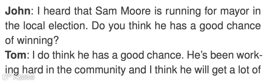 当天晚些时候,在 Sam 离开后,从另一个渠道听到消息的 Tom 和 John 讨论了 Sam 赢得选举的机会: